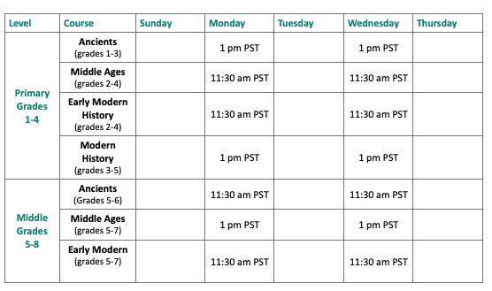 Our online courses run for 30 weeks, with 2 lessons each week, and are a live online form of our History Connections books, highlighting the Islamic history sections. We have online courses for primary grades: grades 1 through 4, and for middle grades, grades 5 through 8.